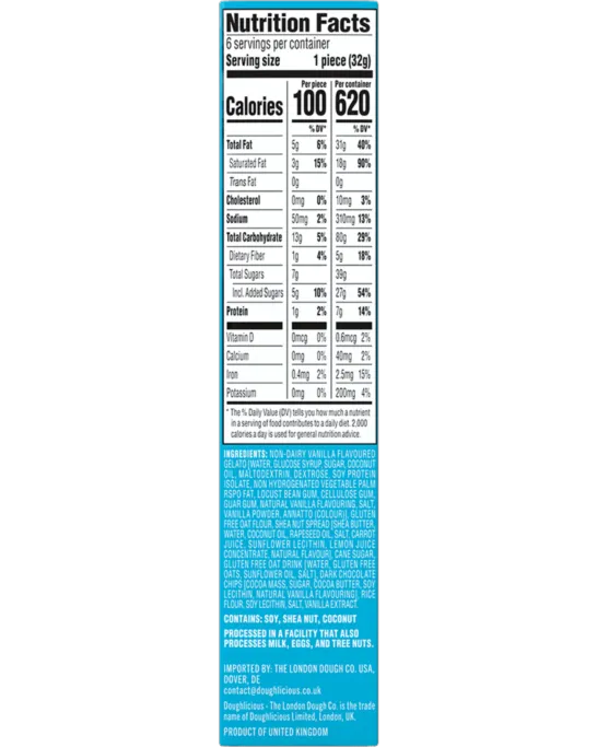Ingredients: Non-Dairy Vanilla Flavoured Gelato [Water, Glucose Syrup, Sugar, Coconut Oil, Maltodextrin, Dextrose, Soy Protein Isolate, Non Hydrogenated Vegetable Palm RSPO Fat, Locust Bean Gum, Cellulose Gum, Guar Gum, Natural Vanilla Flavouring, Salt, Vanilla Powder, Annatto Norbixin (Colour)], Gluten Free Oat Flour, Shea Nut Spread [Shea Butter, Water, Coconut Oil, Rapeseed Oil, Salt, Carrot Juice, Sunflower Lecithin, Lemon Juice Concentrate, Natural Flavour], Sugar, Gluten Free Oat Drink [Water, Gluten Free Oats, Sunflower Oil, Salt], Dark Chocolate Chips [Cocoa Mass, Sugar, Cocoa Butter, Soy Lecithin, Natural Vanilla Flavouring], Rice Flour, Soy Lecithin, Salt, Vanilla Extract.