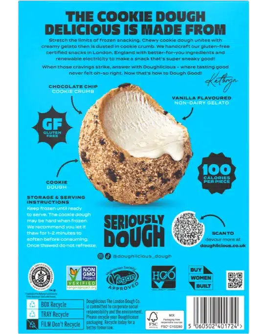 Stretch the limits of frozen snacking with cookie dough & gelato bites. Doughlicious cookie dough unites with creamy gelato then is dusted in cookie crumb. Our hand-crafted, gluten-free certified snacks are made in London, England with the finest ingredients and renewable electricity to make them super sneaky good!