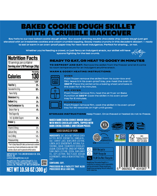Say hello to our new based cookie dough skillet. Our award-winning double chocolate chip cookie dough just got elevated with an irresistible cookies and cream crumble topping. Gooey meets crunchy in this decadent dessert – ready to eat or warm in an over-proof paper tray for next-level indulgence. Perfect for sharing… or not.